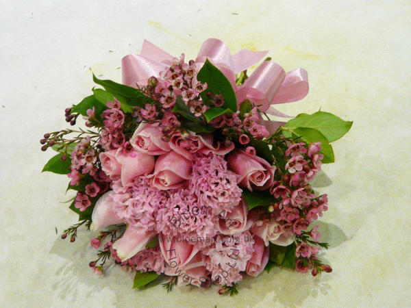 Freestyle Bouquet of Hyacinthus, Pink Roses, waxflower and assorted foliages.